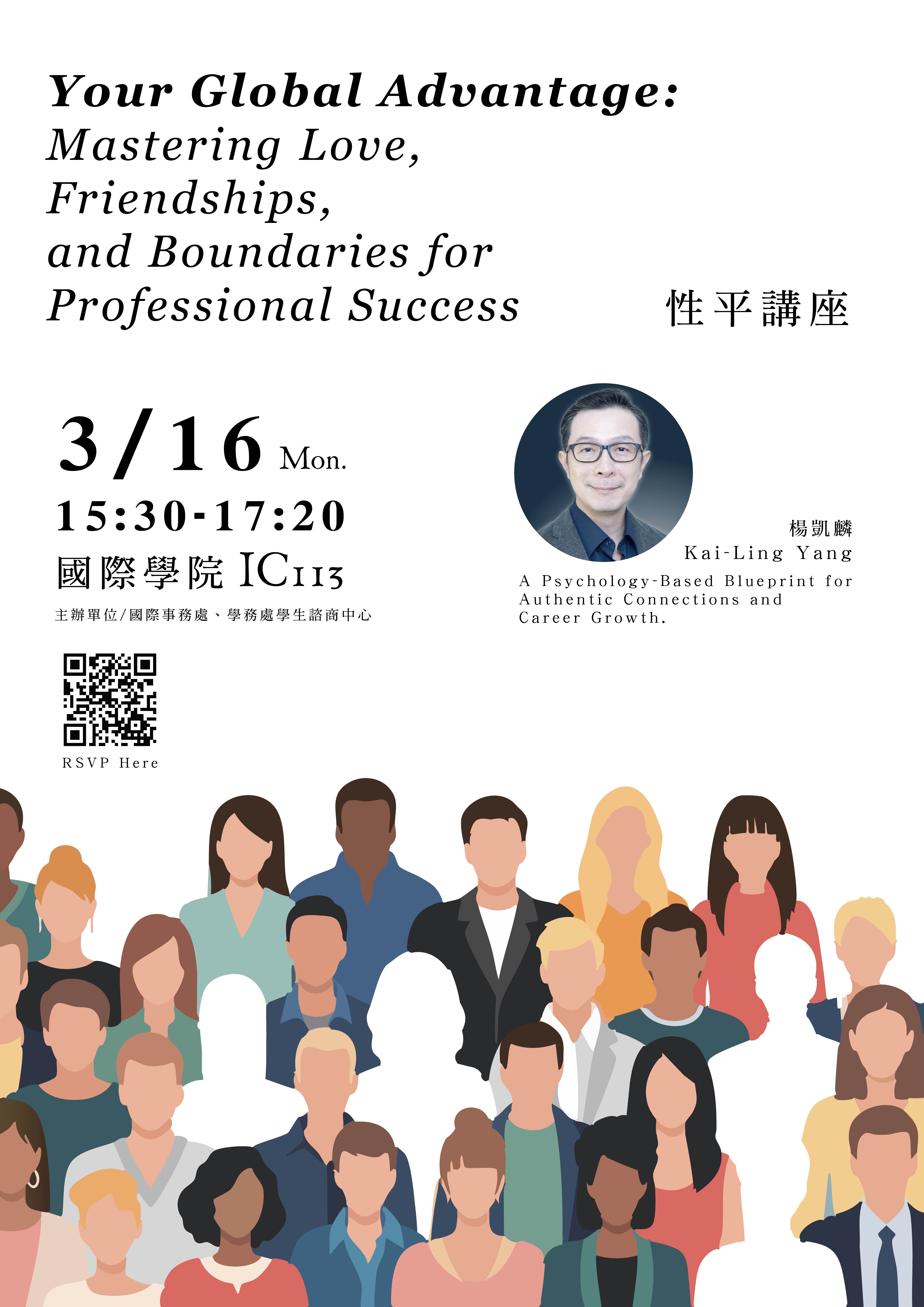 📅 Date: Monday, March 16, 2026 ⏰ Time: 3:30 PM – 5:20 PM 📍 Location: IC113 🔗 RSVP Here: https://forms.gle/mWGVMEYoWR3qk5LJ6 Tag a friend who is aiming for a global career! 👇 #InternationalCareer #GlobalAdvantage #StudyInTaiwan #CrossCulturalLeadership #CareerGrowth #Psychology